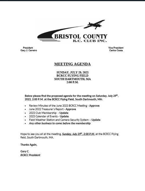 Below please find the proposed agenda for the BCRCC meeting on Tuesday, September 12th, 2023, 7:00 P.M. at the New Bedford Regional Airport - Main Terminal Pilots Lounge: