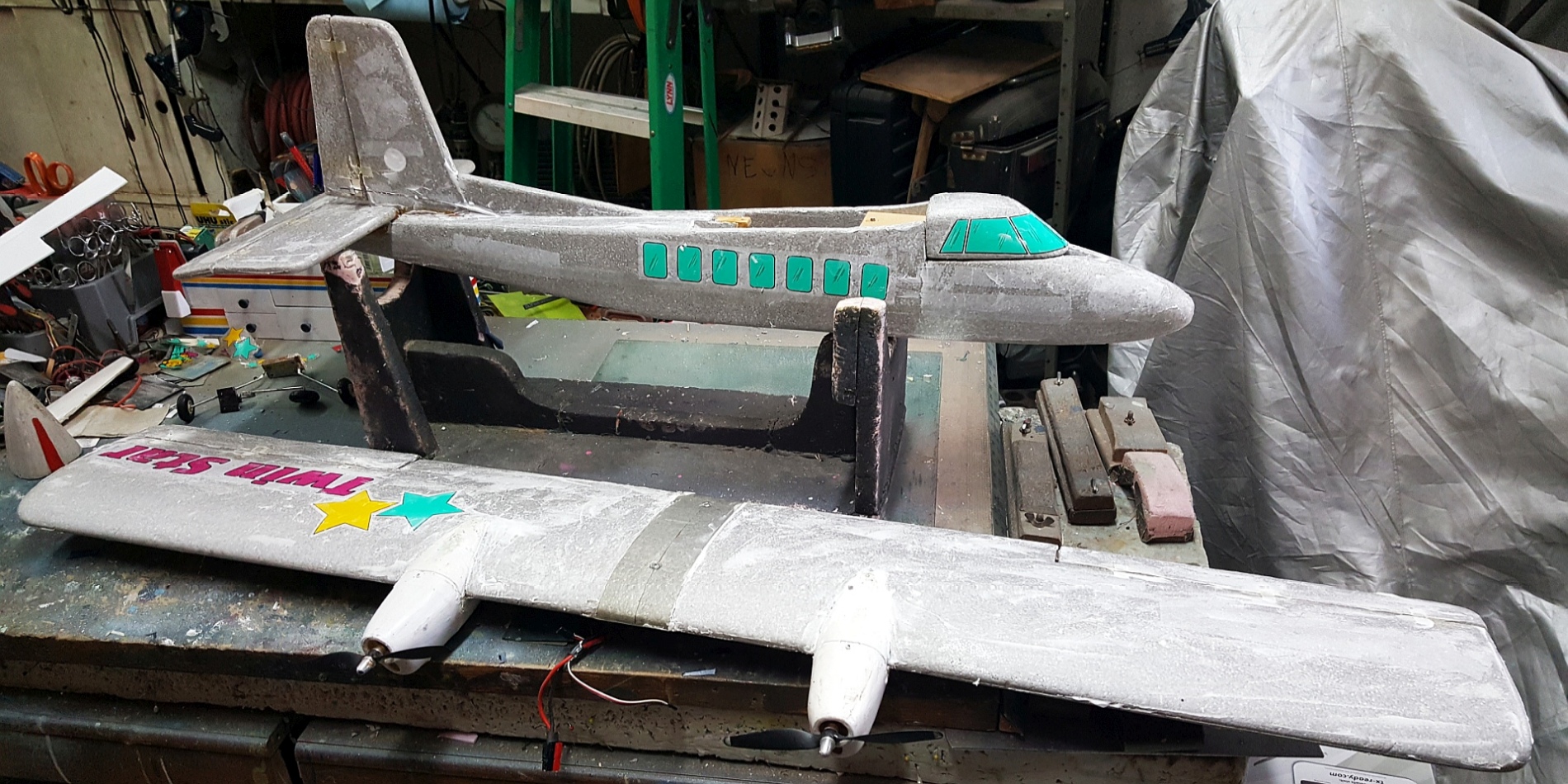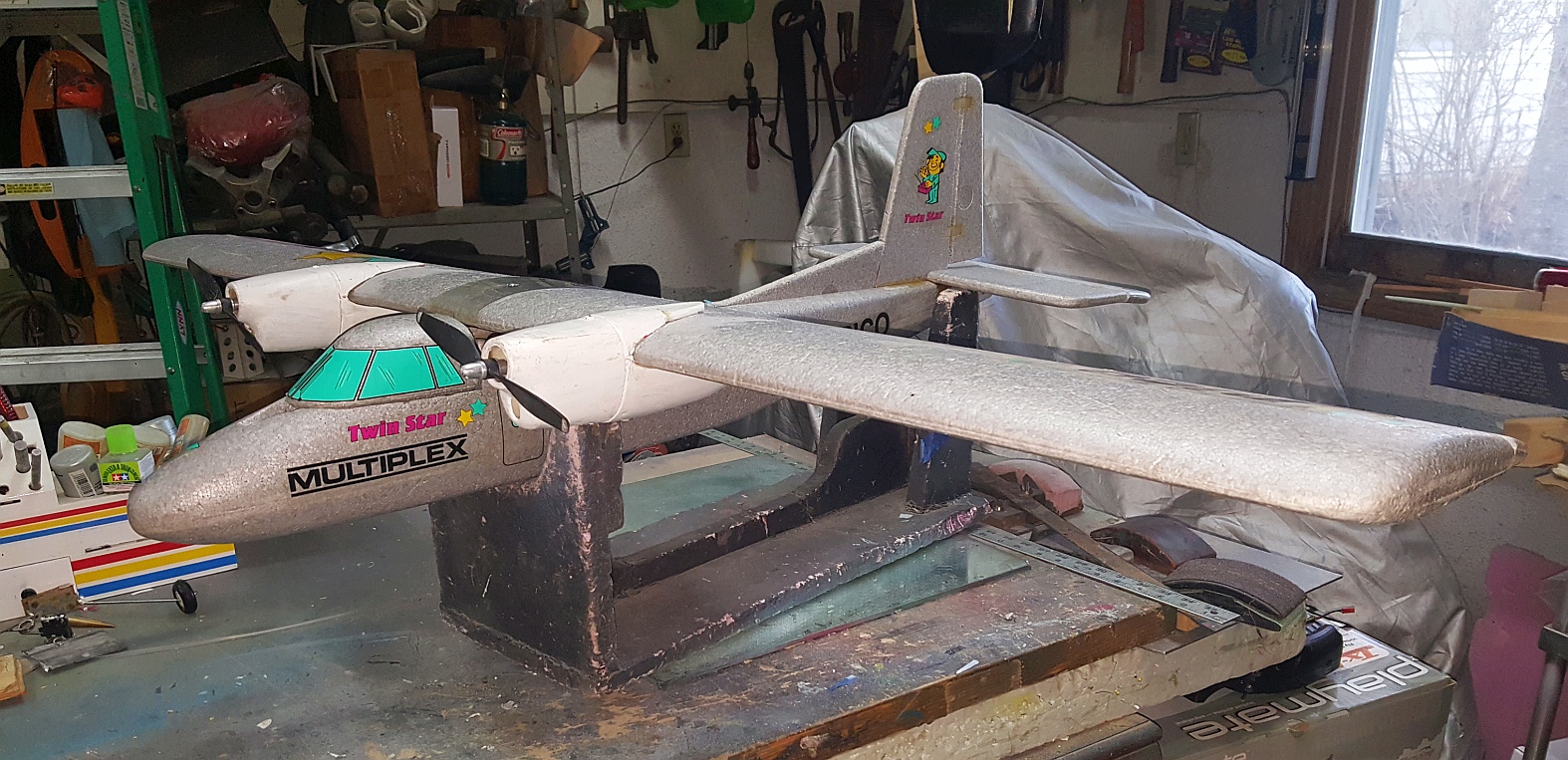 Here is another Twin Star plane that I own now. I got it at an auction again for a throw away price.of $10.00. It seems just before the auction is over the left overs are destined for the dumpster I guess. I may have had an idea I may use it as spare parts. There really was nothing wrong with it. It was nearly all there. It looked like it was all setup and maybe flown. Then the owner may have decided it was not what he wanted and stripped it clean. Never the less a super deal.