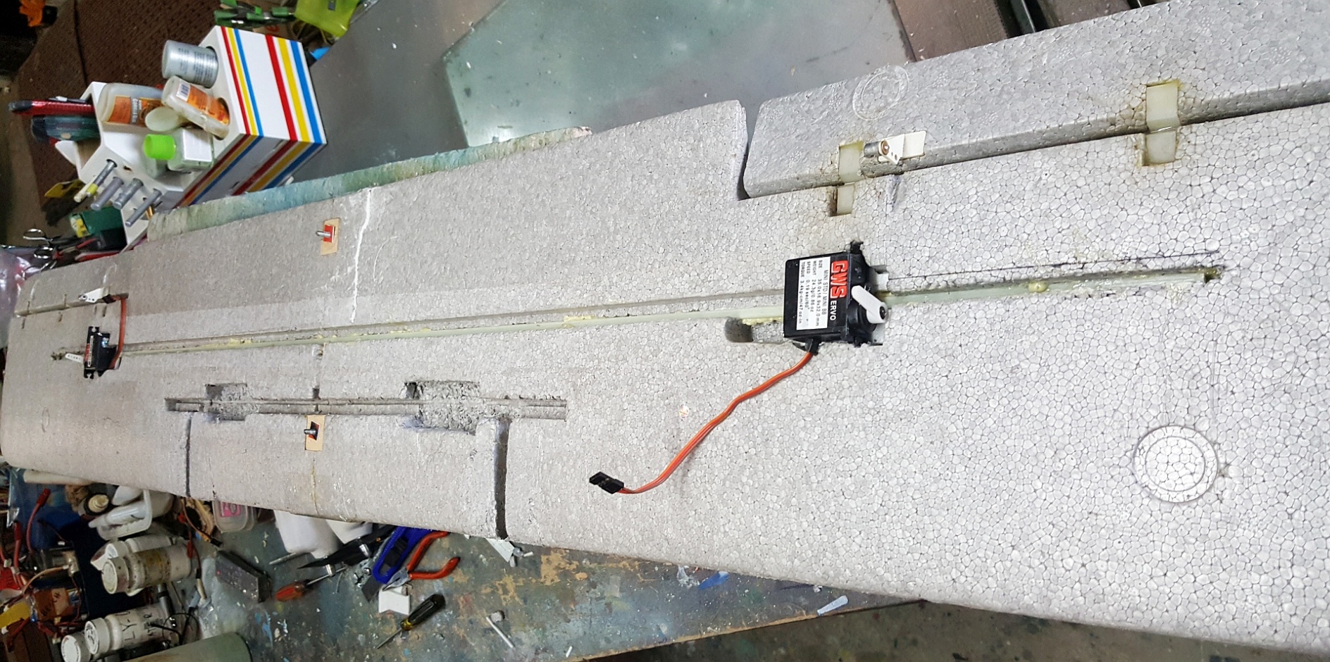In the first photo I installed a 1/4 x 1/4 x48 inch fiberglass spar in the middle of the wing. The two GWS servos were locked in and blocked with a foam pod. Closer to the leading edge is a slot for the wiring of the twin motors, I cut a 20 inch round carbon arrow and buried it along with the motor wires under 1/8 inch Depron and Lite Spackled it in.