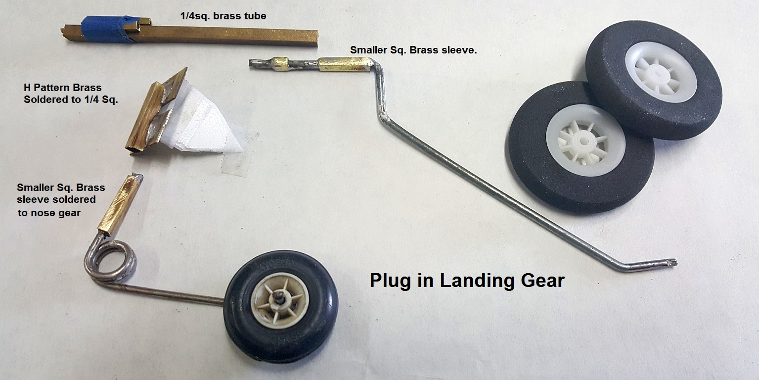 So why do I want to make Plug-in landing gear? I may want to fly with better performance with a lighter plane with the drag and weight reduced, I can hand launch the plane. In the first photo I had a small piece of brass square stock with another piece that slid into it nice and snug. I cut the inner sleeve in three pieces. The outer 1/4in. I I cut a long length to reach across the fuselage, After some measuring and a small hot nail to melt the foam to pass the outer sleeve on through the fuselage.Depending on the sleeve to take all that landing bounce and torque would never work. I used a plywood block with part of the square to fit the slot sawn into it. I then made a plate with 4 screws to clamp the sleeve sq. tightly, I then epoxied everything in place. The nose gear is similar. I soldered the outer sleeve to 2 flat brass pieces in an H pattern. After slitting the nose to push it in on a trial fit I lathered it up and slid it in place. The swept back angle gives a nice spring action. I can press the landing gear in snug with some light grease. When I remove them I pull hard to release them.They can be glued in but not C/A glue. Otherwise they will need lots of heat to remove them with maybe some foam damages. A drop of white glue or hot glue is fine for the friction to hold them. I spent the rest of the day putting in rudder and elevator servos.
