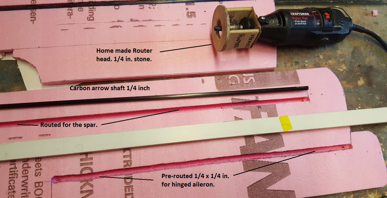 I also made a route in the underside top wing for the aileron hinges while I was at it. My Craftsman type Dremel works good. I made the router adapter out of scrap plywood. I use a stone to cut the foam and I believe it work better and safer than a steel cutter. No dust either. I am only using the scale type ailerons on the model rather than all three wings. My choice. Do not let what I did here deter you from making a slot. You can do it with a straight edge ruler and a sharp razor and make "V" cuts.I am not following the plan exactly. I fly in a very windy area and my plane is heavier and tougher in construction. If you never made this plane follow the build site closely and measure carefully. My next step is to block sand the wings to shape before mounting and using the wing setup gauges on the plan.