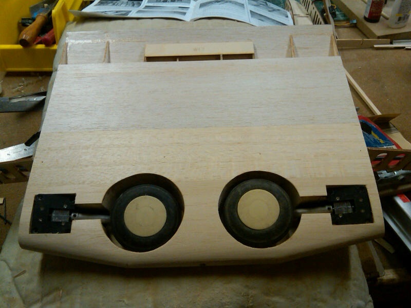 Got a chance to work on the center section some more. Glued up and sanded my sheeting then sheeted the top. I decided to go with torque rods and a separate servo to control the dive brakes rather than use the single flap servo with special linkage. Set the retracts in and tested them for operation and angle. All looks good and they tuck in pretty good when retracted. Will need to make a servo mount behind the aileron servo to put the dive brake servo. Tomorrow with start putting the flap hinge supports and nyrods for the ailerons. I'm going with the old school single servo set up as it will be fine for this bird.