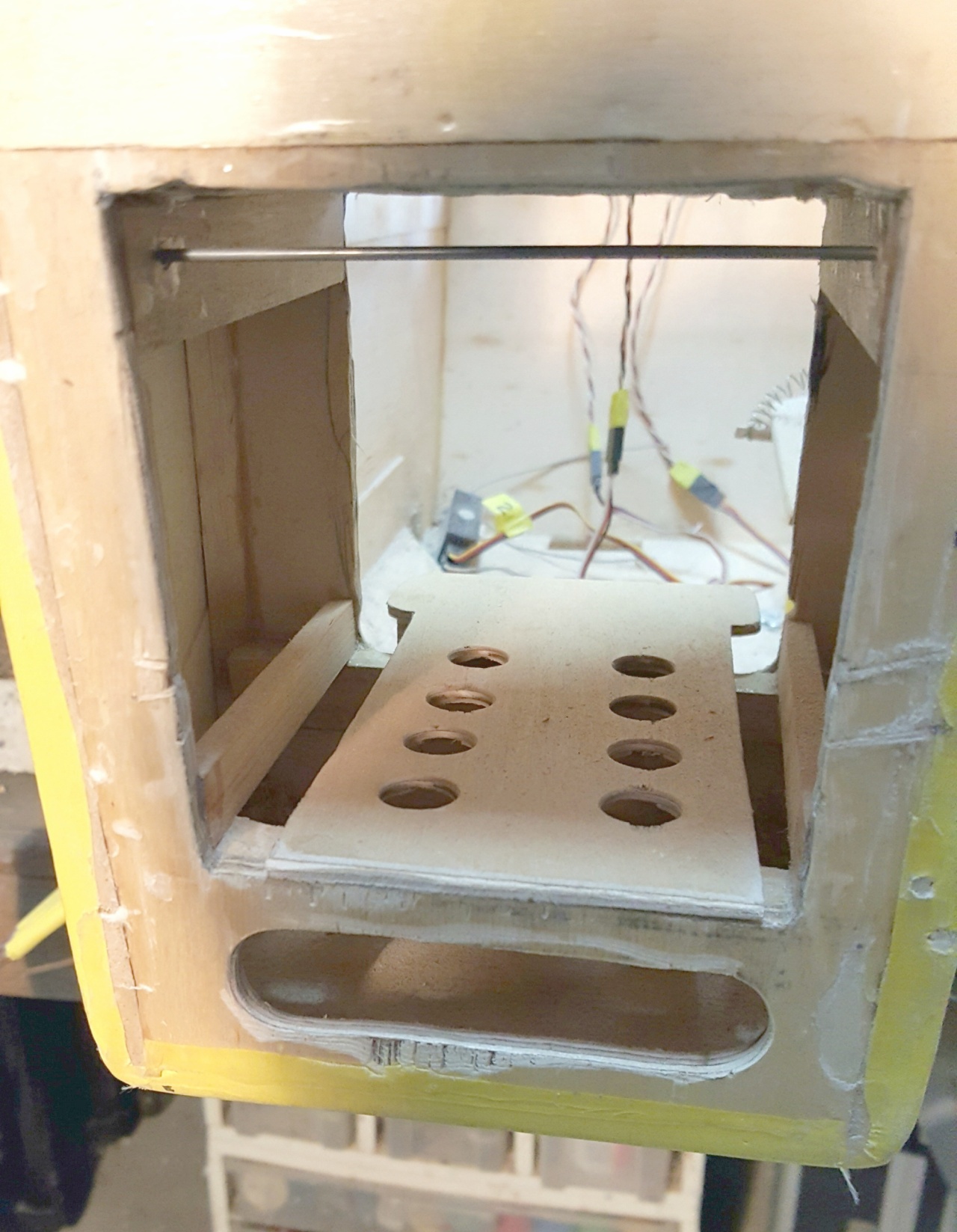 After some trial fits to make sure it slides in and out properly I had to make a bottom and side guides so the draw goes in place straight. Two wood guide o each side and a bottom plate the has holes for air aligned with the drawer tray. Now that the tray fits I determined to put the locking pin right at the same level as the motor shaft. I used a sharpened landing gear wire as the drill for the pilot holes after care was taken to get it straight though and across the drawer tray. I only drilled through 95% of the way. I then fitted a length of brass tubing in place cut in a few correct length pieces. They were CA glued in place. Insert the drawer and pass the wire in place and it is locked now.