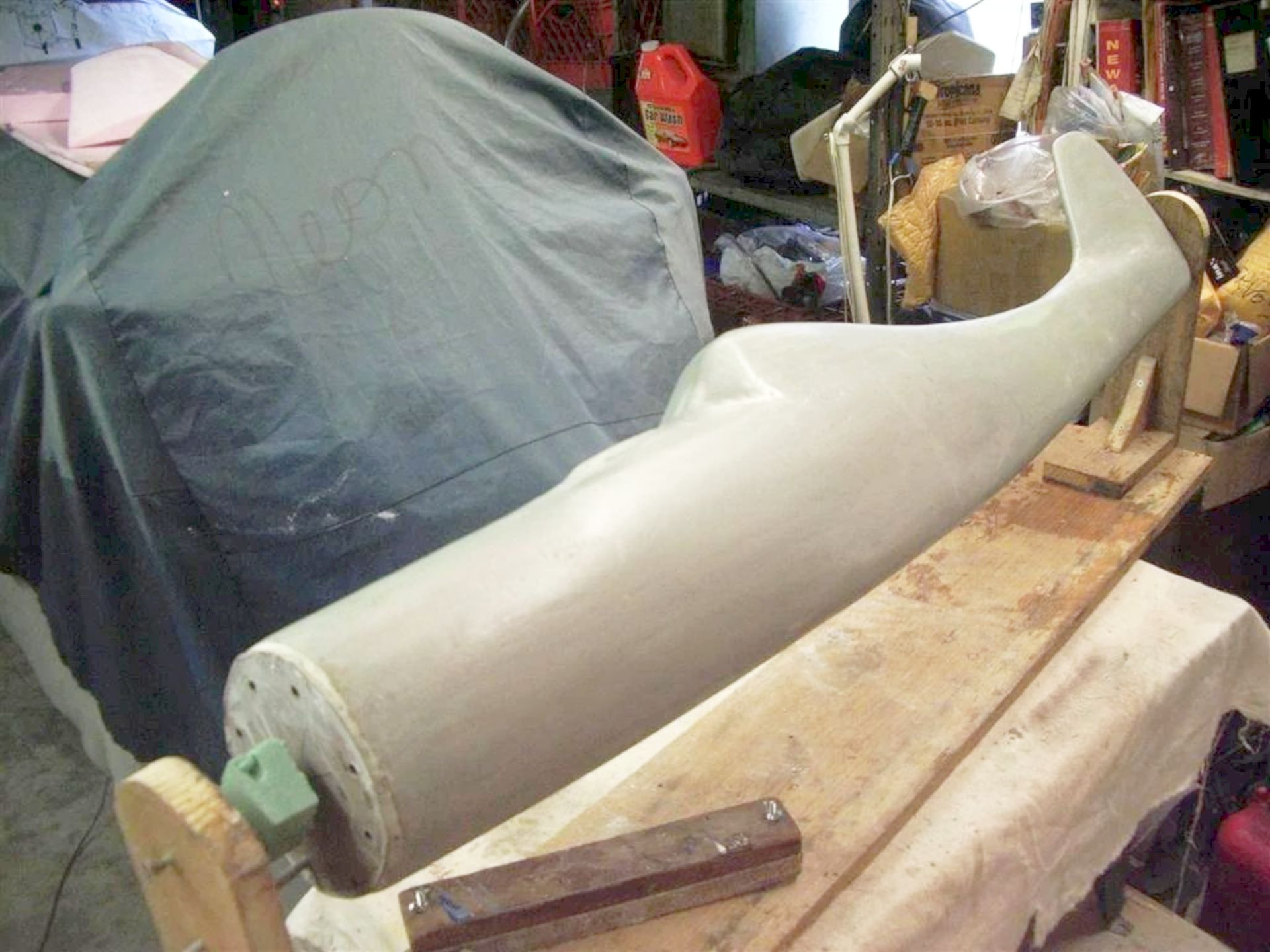 Here are a few progress pictures. The worst is over now. I spent a lot of preparation time to get the fuselage done. The cold air kept things at a slow pace. I cut the fuselage off the mold today and it came out very good. ''It's Alive !!!" I used Seline glass cloth 3.0 oz. in 3 layers and a bit less than a quart of epoxy. The weight is 22oz. as it came off the mold. I did more sanding before I removed the fuselage and I have to bond the release cut underneath tomorrow. More sanding.