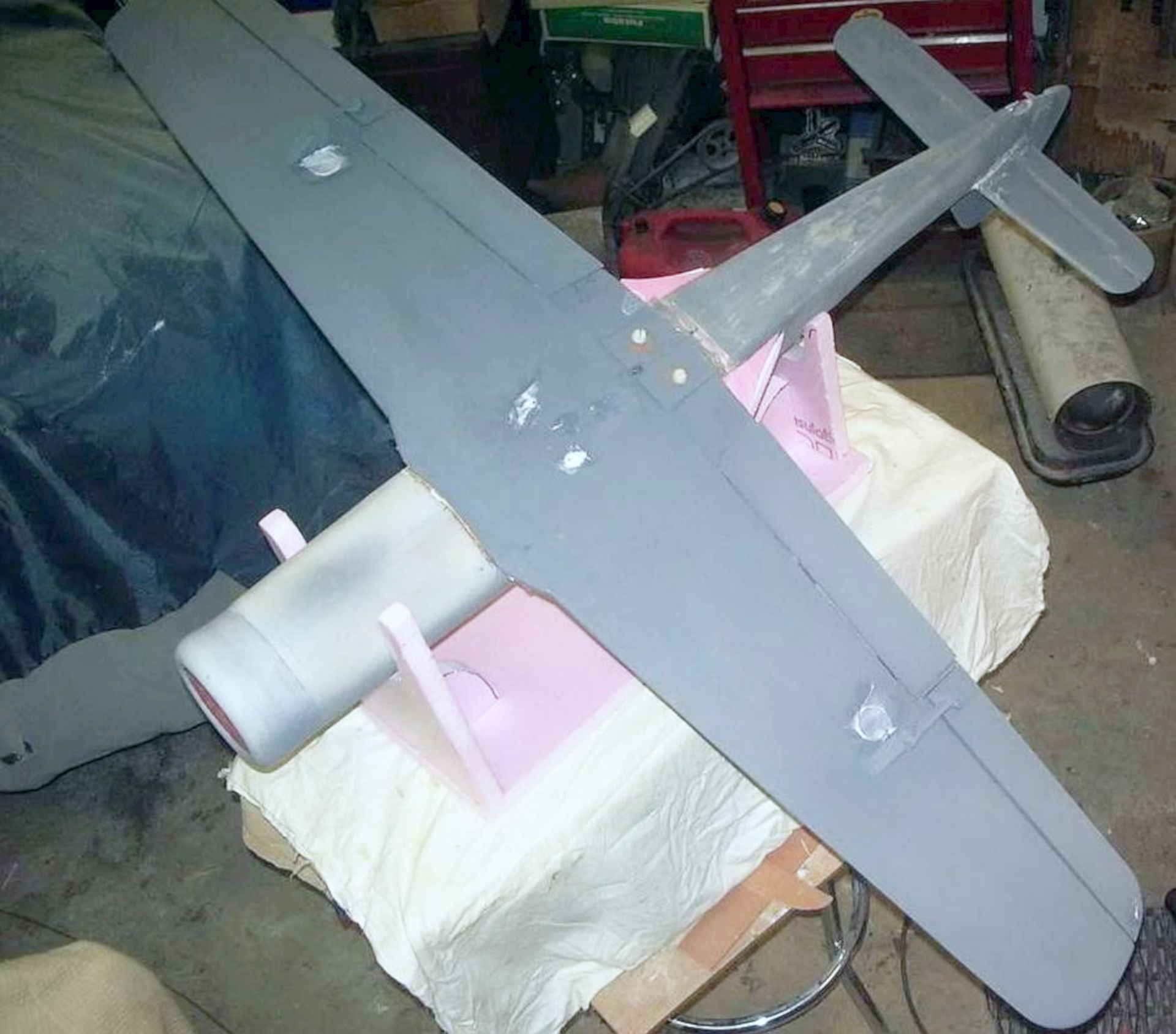 Not much done today due to a time restraint. I spent time messing with the canopy , gun cover, and tail fill sections. I also did more light sanding. At the end of the day I gave it a coat of waterbase gray primer and hung to dry. The foam consists of 2 pieces of green 2 inch thick central layers and 2 pink foam pieces 3/4 inch. They were glued together. The 2 color foams worked good in the sanding as I could compare the lines to make them equal while sanding.