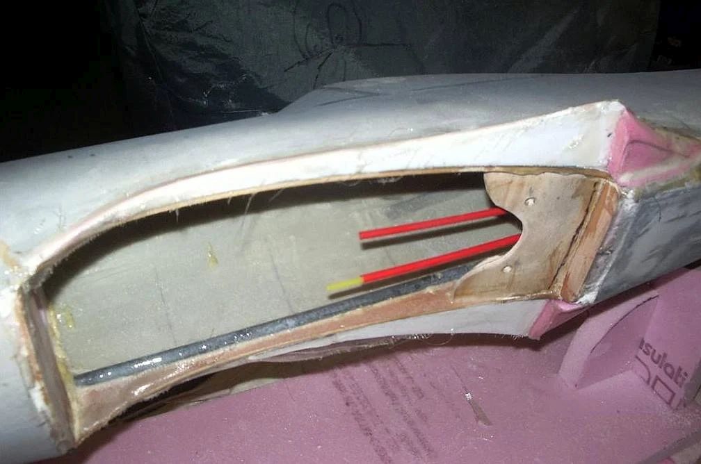 f: Carbon fiber arrow shafts installed above the wing saddled longitudely for lateral strength.